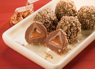 Remove wrappers from caramel filled milk chocolate Kisses. Using about 1 tablespoon milk chocolate mixture for each truffle, shape chocolate around each caramel chocolate piece; roll in hand to make a ball. Be sure to cover each chocolate piece completely. Roll in pecans; refrigerate until ready to serve. For best chocolate flavor, allow truffles to soften at room temperature about 5 minutes before eating.