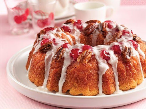 1 Heat oven to 400°F. Spray 8- or 12-cup fluted tube cake pan with cooking spray. Pour 1/3 cup melted butter into pan; turn pan to coat with butter. Sprinkle brown sugar over butter. Arrange cherries and pecans on sugar mixture.