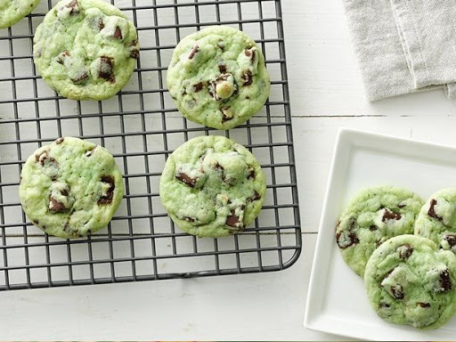 Heat oven to 350°. In large bowl, stir cookie mix, butter, extract, food color and egg until soft dough forms. Stir in creme de menthe baking chips and chocolate chunks.