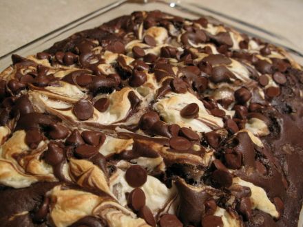 Drop by spoonfuls over the chocolate cake batter, leaving at least a one-inch margin around the sides of the pan (this prevents the cheesecake from bubbling over).