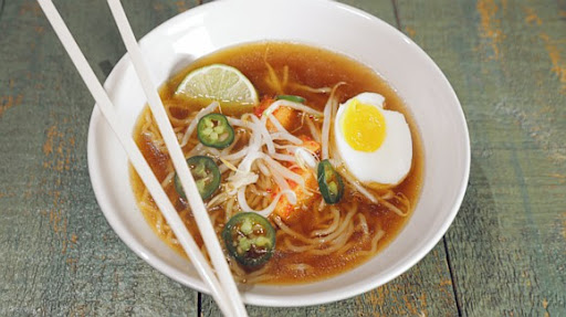 To serve, to 4 individual bowls, add some ramen noodles and ladle over some hot stock. Top with sliced white scallions, beans sprouts and an egg. Add lime wedge, kimchi and jalapenos to taste.