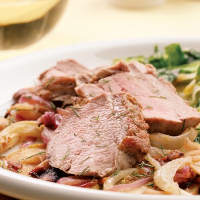 4. Transfer the pork to a cutting board and let rest for 5 minutes. Immediately stir vinegar into the pan (be careful, the handle will be hot), scraping up any browned bits, then add to the apple mixture. Thinly slice the pork; serve with the apple mixture and sprinkle with fennel fronds.