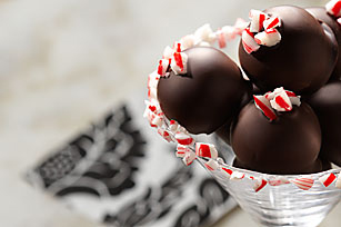 SHAPE into 48 (1-inch) balls. Freeze 10 min. Dip balls in melted chocolate; place on waxed paper-covered rimmed baking sheet. Sprinkle with reserved candy.