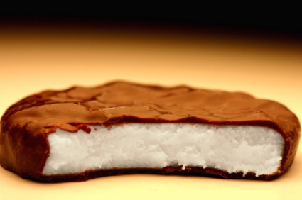 In the microwave, melt chocolate and shortening. Dip frozen patties in chocolate. Let harden. Keep in airtight container.