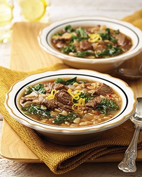 Stir in stock, water, tomato paste, salt, and pepper flakes; cover and bring to a boil. Reduce heat to medium-low and simmer 10 minutes. Stir in barley and simmer 10 minutes more. Return soup to a boil and stir in kale; cook, uncovered, to wilt kale, 3 minutes.