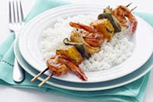 GRILL kabobs 4 to 6 min. or until shrimp turn pink, turning and brushing occasionally with the barbecue sauce. Serve over hot cooked rice.