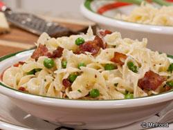 In same skillet, over medium heat, heat half-and-half with garlic until bubbles form around edges. Whisk in 3/4 cup cheese, salt and pepper just until it starts to thicken. Stir in bacon, peas and parsley, and cook over low heat 5 minutes, stirring occasionally.