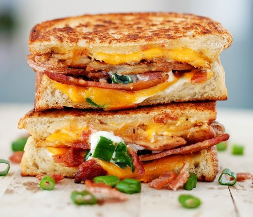 While everything is cooking, slice your bread (use some crusty bread like french or sourdough if you have it), and generously butter the outside of each piece. On the inside, put about 1 tablespoon of sour cream on each slice as well as slices of cheddar cheese on each side. Once your potatoes and bacon are finished frying, dab them on paper towel to remove some grease, then fan the potatoes out on your bottom slice of bread, put a little more sour cream on top of the potatoes if you desire (I did to help the bacon and chives stick in the sandwich). Slice up one green onion stalk and spread it on top of the potatoes along with the bacon. Place your other slice of cheese on top of all of this and top with your bread!