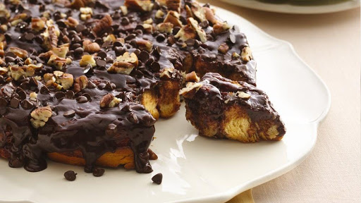 3 Bake 28 to 32 minutes or until deep golden brown. Turn pan upside down onto heatproof serving plate. (Replace any topping in pan onto rolls.) Immediately sprinkle with chocolate chips and pecans. Cool 5 to 10 minutes. Serve warm.