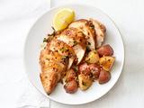 Remove the baking dish from the oven, push the potatoes to the sides and arrange the chicken breasts in the middle. Season the chicken with salt and drizzle with the garlic mixture. Return to the oven and bake until the chicken is cooked through and the potatoes are tender, 15 to 18 minutes. Remove from the oven; transfer the chicken to a cutting board and slice. Add the cilantro to the baking dish and toss with the potatoes. Serve the chicken with the potatoes and lemon wedges. Drizzle with the pan juices.