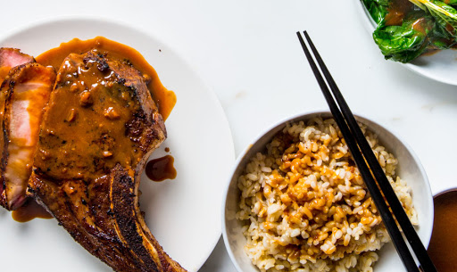 Preheat a large skillet, preferably cast iron, or grill pan over medium. Remove pork from bag, shaking off excess marinade. Cook pork chops until bottom side is golden brown, about 1 minute. Turn and cook on other side about 1 minute, then turn again. Continue to cook, turning about every minute, until chops are deep golden brown and charred in spots and an instant-read thermometer inserted into the thickest part registers 135°, 15–18 minutes (cooking time will depend on thickness of chops). Transfer to a cutting board and let rest at least 10 minutes (pork will come to 145° as it sits). Serve with reserved hoisin sauce spooned over.