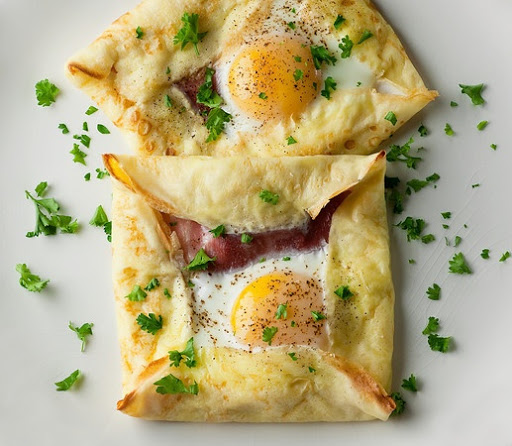 Preheat oven to 350°F. Place crepes on a rimmed baking sheet (you can fit 3 to 4 per sheet). Place ham slice in center of crepe and carefully crack egg onto ham. Fold edges of crepe toward center, using the egg white as a kind of glue. Season with salt and pepper and bake until egg white is set, about 10 to 12 minutes. Sprinkle with chopped parsley and serve at once.