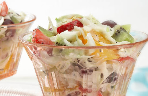 New twist on a summer favorite. Sweet and creamy, this recipe mixes cabbage, oranges, grapes, strawberries and kiwi all tossed in Marzetti Original Slaw Dressing.