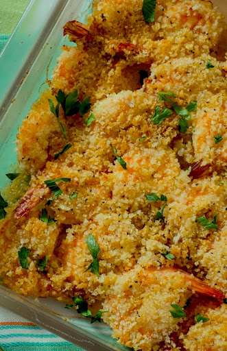 3. In a small bowl, mix the panko crumbs with butter, Parmesan, and black pepper. Sprinkle the panko mixture over the shrimp, pat it onto the shrimp lightly, and bake for 12-15 minutes, or until shrimp is cooked and crumbs are brown. Sprinkle with parsley, if desired.