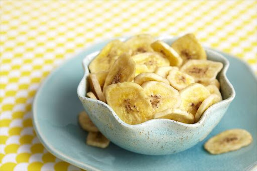 2. Place on trays and let dry for a few hours to overnight after dipping in lemon juice to keep from discoloration, bake 2 hours at 175 until chewy or crisp. The greener the banana the crisper the chip: the riper the sweeter. They’re delicious plain and natural, or sprinkle with sugar or Splenda.