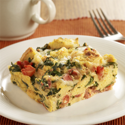 Heat skillet over medium-high heat. Add onion; cook 4 minutes or until lightly browned, stirring occasionally. Add spinach; cook and stir until wilted. Add spinach mixture to Egg Beaters mixture; stir to combine. Gently stir in drained tomatoes just until combined. Place mixture in dish; top with remaining 1/4 cup cheese.