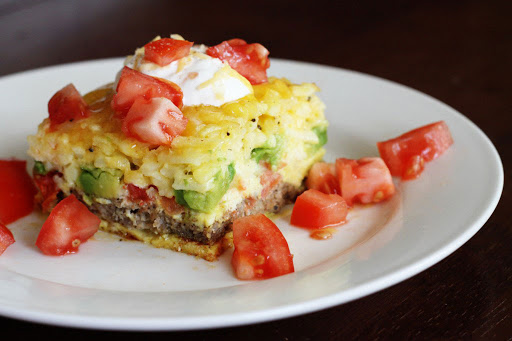 ◦In a bowl, beat eggs and milk. Stir in all other ingredients. Pour hash and egg mixture over the sausage, tomatoes, and avocados.