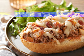 BROWN meat with onions in large skillet. Meanwhile, cut bread crosswise in half, then cut each piece lengthwise in half. Place, cut-sides up, on foil-covered baking sheet.