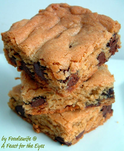 This recipe comes from Cook's Illustrated (May 2006). These are super fast to make-- you can do it all by hand. The beauty of this recipe is that you melt the butter. The end result-- buttery, sweet chocolate chip cookies in a bar. These are perfect for lunch boxes, but you might need to hide them. They disappear fast!