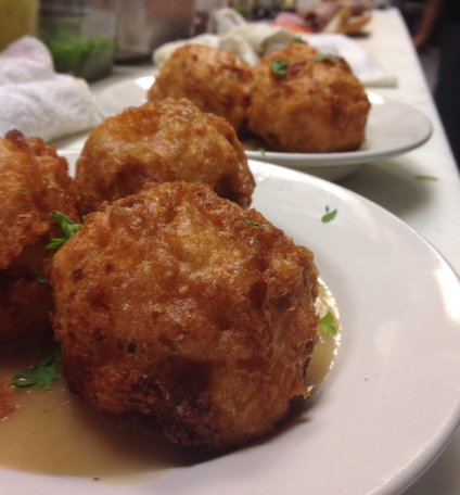 Dredge balls in reserved flour and then dip into beer batter.