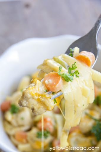 Add cream of chicken soup, milk, chicken broth, pasta and dry seasonings. Stir.