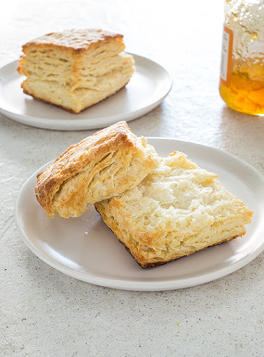 For the ultimate flaky biscuits, we grate the butter so that it’s evenly distributed in the flour mixture, which is key for flakiness. Freezing the butter prior to grating ensures that it stays in individual pieces throughout the mixing and shaping process. Using a higher-protein all-purpose flour (such as King Arthur) provides the right amount of structure for flakiness (rather than fluffiness, which you’d get with a lower-protein flour) without toughness, while buttermilk gives the biscuits tang and sugar lends complexity. To produce the maximum number of layers, we roll out and fold the dough like a letter five times. Cutting the biscuits into squares is easy and avoids any wasted scraps (or tough rerolls). And finally, we learned that letting the dough rest for 30 minutes and trimming away the edges ensures that the biscuits rise up tall and true in the oven.