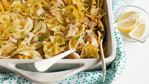 4. Cook onion over medium-high heat 4 to 5 minutes or until soft and translucent. Add garlic; cook an additional minute. Beat in flour with whisk, and cook a minute or two. Slowly beat in stock and milk. Simmer until thickened slightly. Taste for seasoning; add more salt and pepper to taste. Pour sauce into bowl with pasta and chicken. Add lemon peel; stir to coat pasta and chicken. Spread mixture in casserole; sprinkle with green onions. Bake 20 minutes.