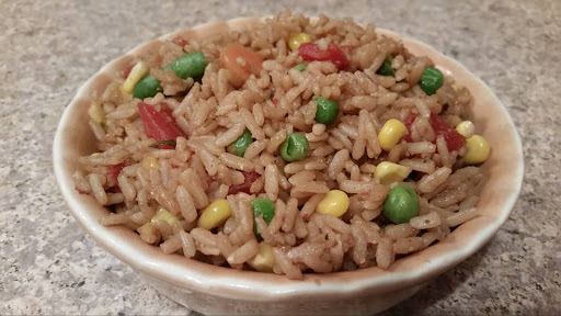 Open lid and add 1 bag of frozen mixed veggies -thawed, 1 can diced tomatoes with garlic and basil (drained),1 tsp onion powder, a little pepper, and soy sauce to taste (I didn't measure that... I just kept adding until I liked it!). The rice was just a TINY bit soft, but not stuck to the bottom of the pot at all. The liquid from the veggies and the soy sauce made it perfect!
