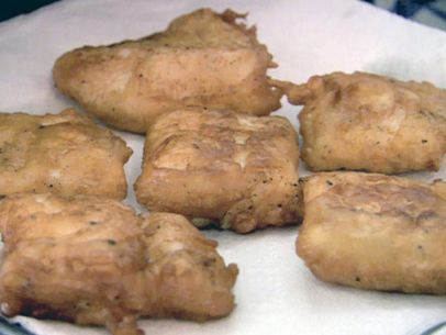 Dip each fillet into the batter, allowing the excess to drip back into the bowl. Place it very carefully into the hot oil. Don't crowd the pieces. Adjust the heat as needed to keep the oil between 360 and 400 degrees F. Cook the fish on each side for 2 to 3 minutes, until lightly browned and cooked through. Remove to a plate lined with a paper towel. Sprinkle with salt and serve hot with the "chips."