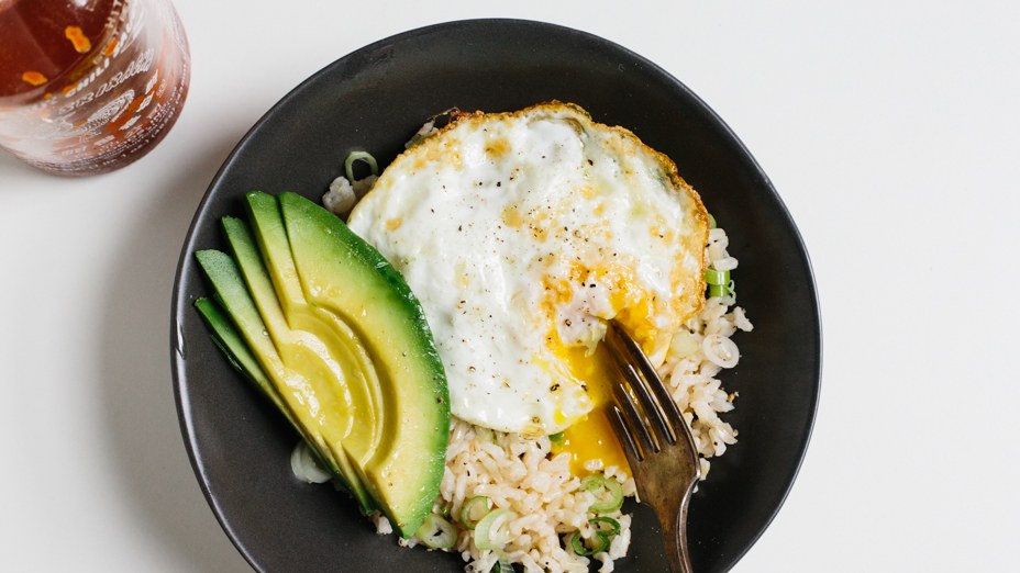 Divide rice among bowls; top with eggs, avocado, and hot sauce.
