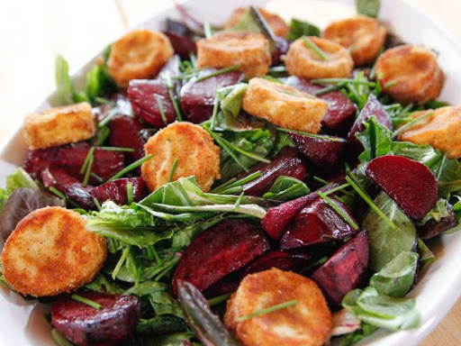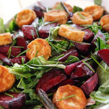 Whisk the mustard and sugar into the reserved dressing, then pour over the greens in a large bowl and toss to coat. Divide the greens among 6 plates, add the beets on top and place 2 fried goat cheese slices on top.