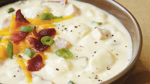 Stir in ham, half of the bacon, the sour cream, 2 cups of the cheese and 1/2 cup of the green onions. Cook until thoroughly heated and cheese is melted. Evenly top individual servings with remaining bacon, 1/2 cup cheese and 1/4 cup green onions.