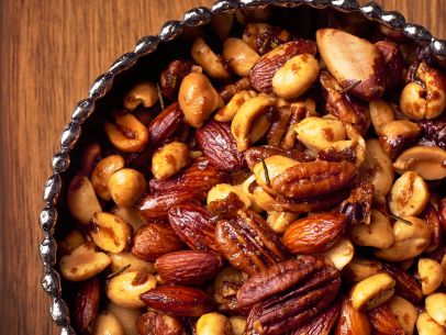 Preheat the oven to 350 degrees F. Toss the nuts, melted butter, rosemary, brown sugar and cayenne in a large bowl until combined. Spread the coated nuts in a single layer on a rimmed baking sheet.