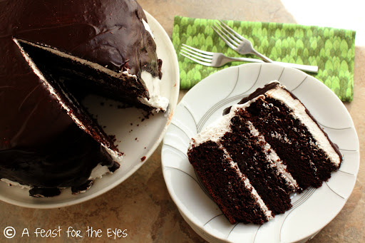 This recipe name is a mouthful, right? I was dubious that Guinness beer would work in a chocolate cake. I will never doubt that again! The cake turns out super moist with a very tender crumb. There is no beer after taste. Instead the chocolate flavor is intensified. The Italian meringue isn't difficult to make at all, and has a billowy marshmallow like texture. It's a beautiful contrast to the chocolate cake. If you love Dark Chocolate, then the Ganache sits crowns the cake with a perfect touch. This cake is very tall, and makes a beautiful statement when you serve it at a dinner party or for a special birthday. It's not hard to make at all, but it looks like a professional bakery made it. Thanks to the food blog "My Man's Belly" for sharing this recipe so that I could, too.