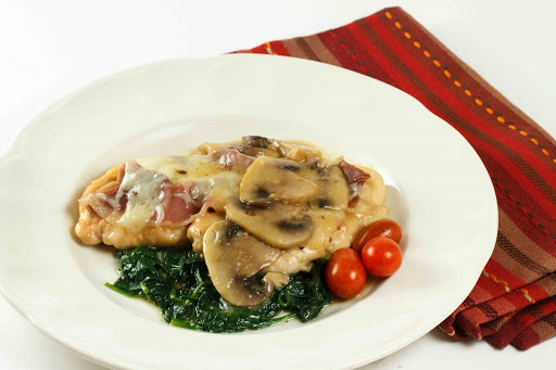 Sauteed spinach, chicken breast then top with mushrooms and pan sauce
