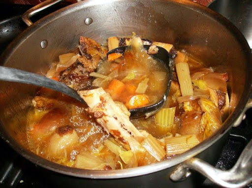 Put everything into a large stockpot. Add the peppercorns. garlic,herbs and season with salt. Add the water. Bring the liquid up to a boil and reduce to a simmer. Simmer the stock for 4 hours, skimming regularly. Remove from the heat and strain through a china cap, cheese cloth or fine strainer.
