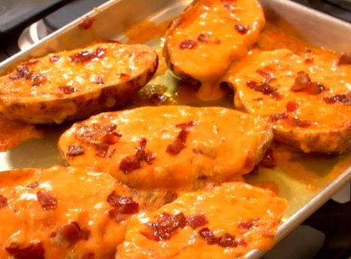 Bake stuffed potato skins until tops are golden brown, about 15 minutes. Remove from oven and top with more sour cream and chives before serving.