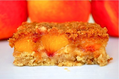 The base is a shortbread-like tasting cake with a gooey peach center and a crispy brown sugar streusel topping that makes these bars absolutely irresistible.