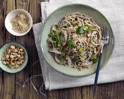 In a pot, boil 3 quarts of water. Add noodles and stir. Cook until tender, 5 minutes.In a large, shallow bowl, whisk the tamari, sesame oil, peanut butter, vinegar, 2 tablespoons water, ginger, and garlic.