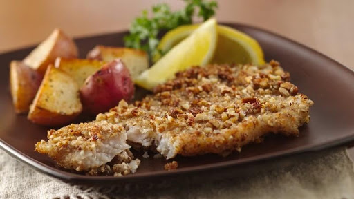 2. Cut fish into 4 serving pieces. Sprinkle both sides of fish with salt and pepper. Coat fish with egg mixture, then coat well with pecan mixture, pressing slightly into fish.
