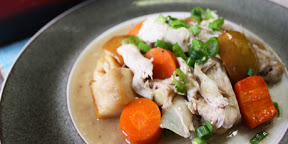 To serve, remove the chicken from the roaster, carve out the bones and return the meat to the pan. Stir the works all together and garnish with green onions. Share.
