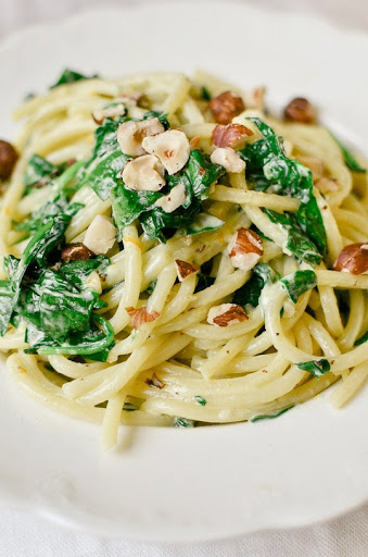 Spaghetti with Mascarpone, Meyer Lemon, Spinach, and Hazelnuts