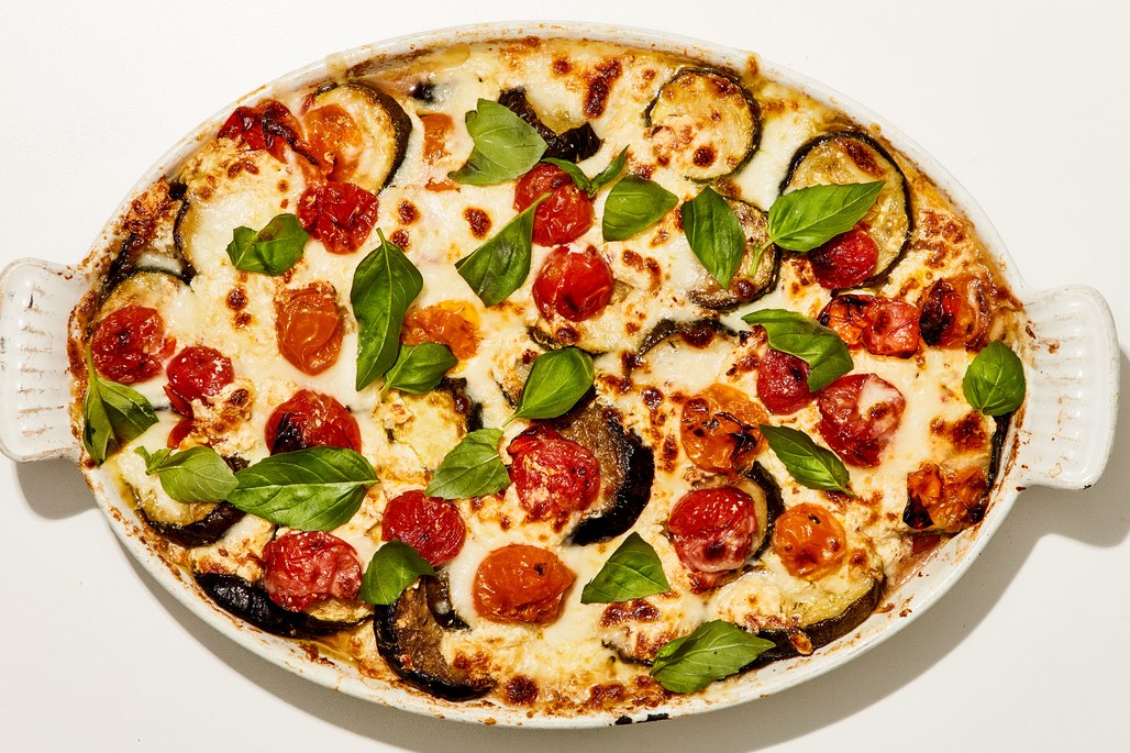 Drizzle some oil into a shallow 2-qt. baking dish. Arrange one-third of zucchini and eggplant slices in a single layer. Scatter one-third of blistered tomatoes over, then dollop half of ricotta mixture over tomatoes. Tear one-third of basil leaves and scatter over ricotta.