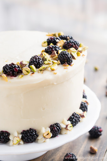 Place one cake round on a plate or cake platter and then frost the top of it. Top with another cake round and frost again. Add the last cake round and then add a thin layer of frosting (crumb coat) to the top and sides of the cake. Refrigerate the cake for 30 minutes and then frost the cake with the remaining frosting (save some of the frosting in a piping bag if you wish to decorate with frosting). Garnish with extra frosting, pistachios, and/or berries as desired.