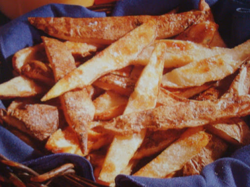wide strips, leaving some flesh intact. Save excess potato flesh for another use. Reserve skins.