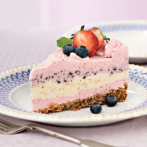 Fresh strawberries team up with blueberries and bananas for a triple-layered ice cream treat. The big surprise? Crushed waffle cones in the crust.