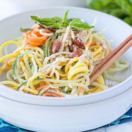 Using a spiral vegetable slicer, or spiralizer, slice the cucumber into vegetable noodles and discard the seeds. Alternatively, use a julienne slicer to make long strips. Place the noodles in a large bowl and continue with the remaining vegetables.