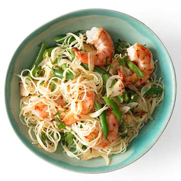 Meanwhile, heat oil in large skillet over medium-high heat. Add shallots, garlic and red pepper flakes; cook 1 minute. Add shrimp. Cook 1 minute, flip and cook 1 minute more. Stir in parsley.