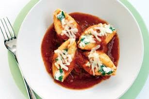 HEAT oven to 400°F. Mix cottage cheese, spinach, 1/2 cup mozzarella, Parmesan and seasoning; spoon into shells.