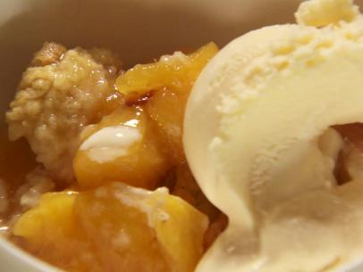 Bake in the oven for about 1 hour, checking about 30 minutes in to see if the top is nice and brown. Once top is browned you your liking, cover loosely with foil for the remainder of the bake time. Allow to sit for 10 to 15 minutes before serving. If the cobbler is too juicy, use a turkey baster to remove a little of the juice, or spoon the juice over ice cream. Serve warm with vanilla ice cream or fresh whipped cream.
